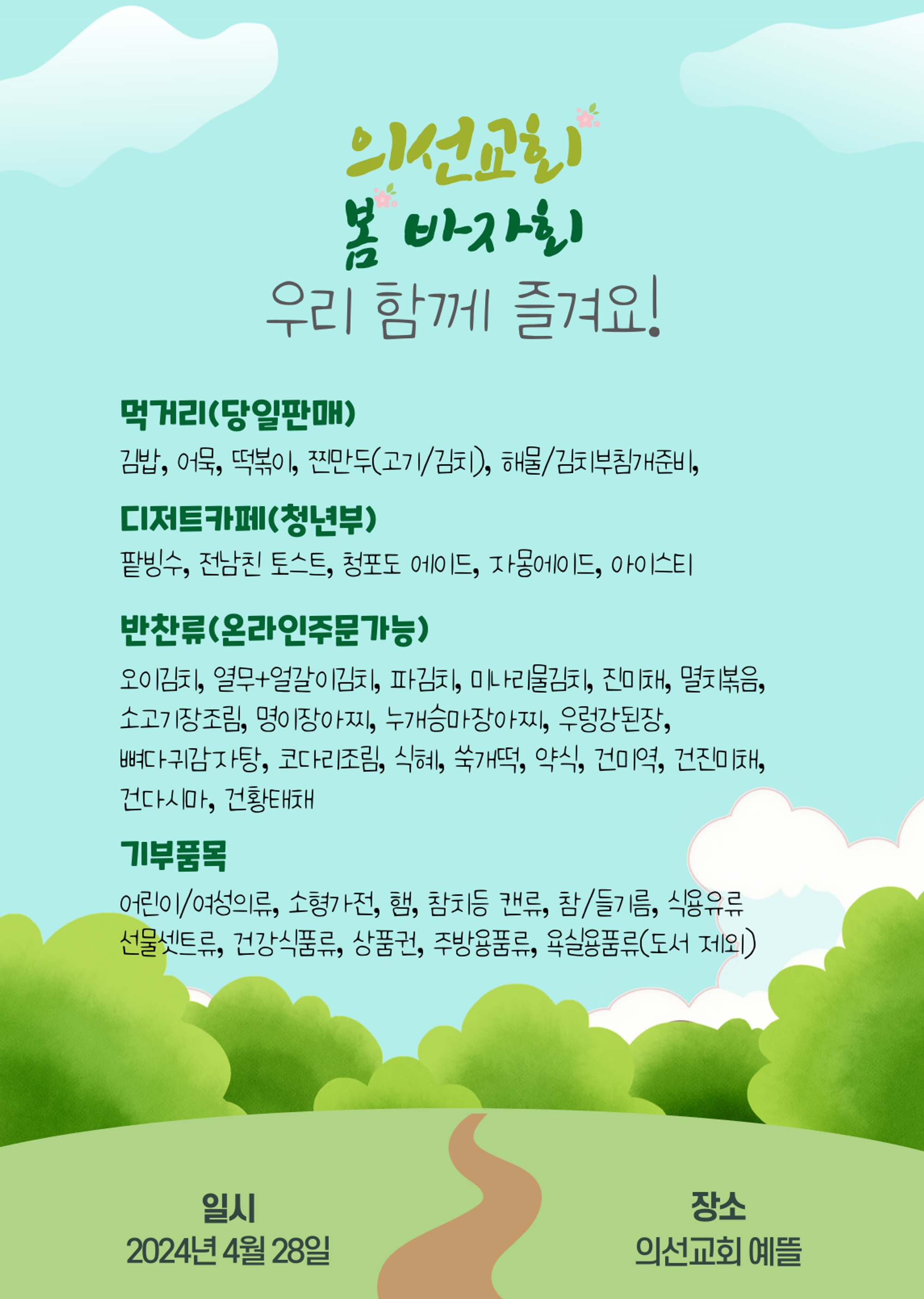 4월 28일 주일 1부 예배 후부터 의선 바자회가 예뜰에서 열립니다.